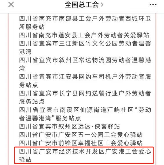 近日,全國總工會發(fā)布2023年“最美工會戶外勞動服務(wù)站點”名單,廣安港工會愛心驛站上榜。