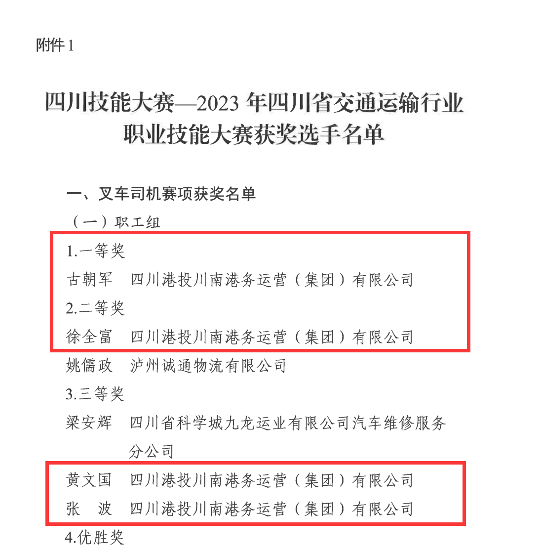 大賽期間,來(lái)自全省港口物流行業(yè)、交通學(xué)校等共計(jì)150名選手展開技能大比拼。經(jīng)過(guò)激烈角逐,四川港投川南港務(wù)公司所屬的瀘州港古朝軍以及宜賓港徐全富、張波、黃文國(guó)4人,憑借出色的表現(xiàn)和精湛的技能,在四川省眾多選手中脫穎而出,取得“叉車司機(jī)賽項(xiàng)職工組”第一名、第二名、第五名、第六名的成績(jī),最終榮獲“叉車司機(jī)賽項(xiàng)職工組”一、二、三等獎(jiǎng)!此外,川南港務(wù)公司榮獲“組織工作優(yōu)秀單位”稱號(hào);瀘州港古朝軍作為大賽第一名,將向四川省人力資源和社會(huì)保障廳申報(bào)“四川省技術(shù)能手”稱號(hào)。