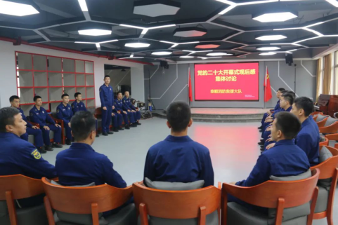 內蒙古森林消防總隊赤峰市支隊紅山區(qū)中隊消防救援人員采取情景式、啟發(fā)式方式學習黨的二十大報告,集體暢談心得體會。林柏楊?攝