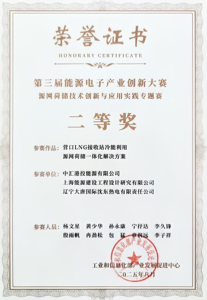 8月20日至22日,由工業(yè)和信息化部產(chǎn)業(yè)發(fā)展促進(jìn)中心主辦的“第三屆能源電子產(chǎn)業(yè)創(chuàng)新大賽源網(wǎng)荷儲技術(shù)創(chuàng)新與應(yīng)用實(shí)踐專題賽決賽暨典型作品交流會(huì)”在青島舉行,大賽聚焦“源網(wǎng)荷儲一體化”,旨在推動(dòng)產(chǎn)業(yè)創(chuàng)新和技術(shù)落地,支持新型能源體系建設(shè),助力實(shí)現(xiàn)“雙碳”目標(biāo)。由中港能源牽頭,與合作單位共同打造的《營口LNG接收站冷能利用源網(wǎng)荷儲一體化解決方案》榮獲大賽二等獎(jiǎng)。