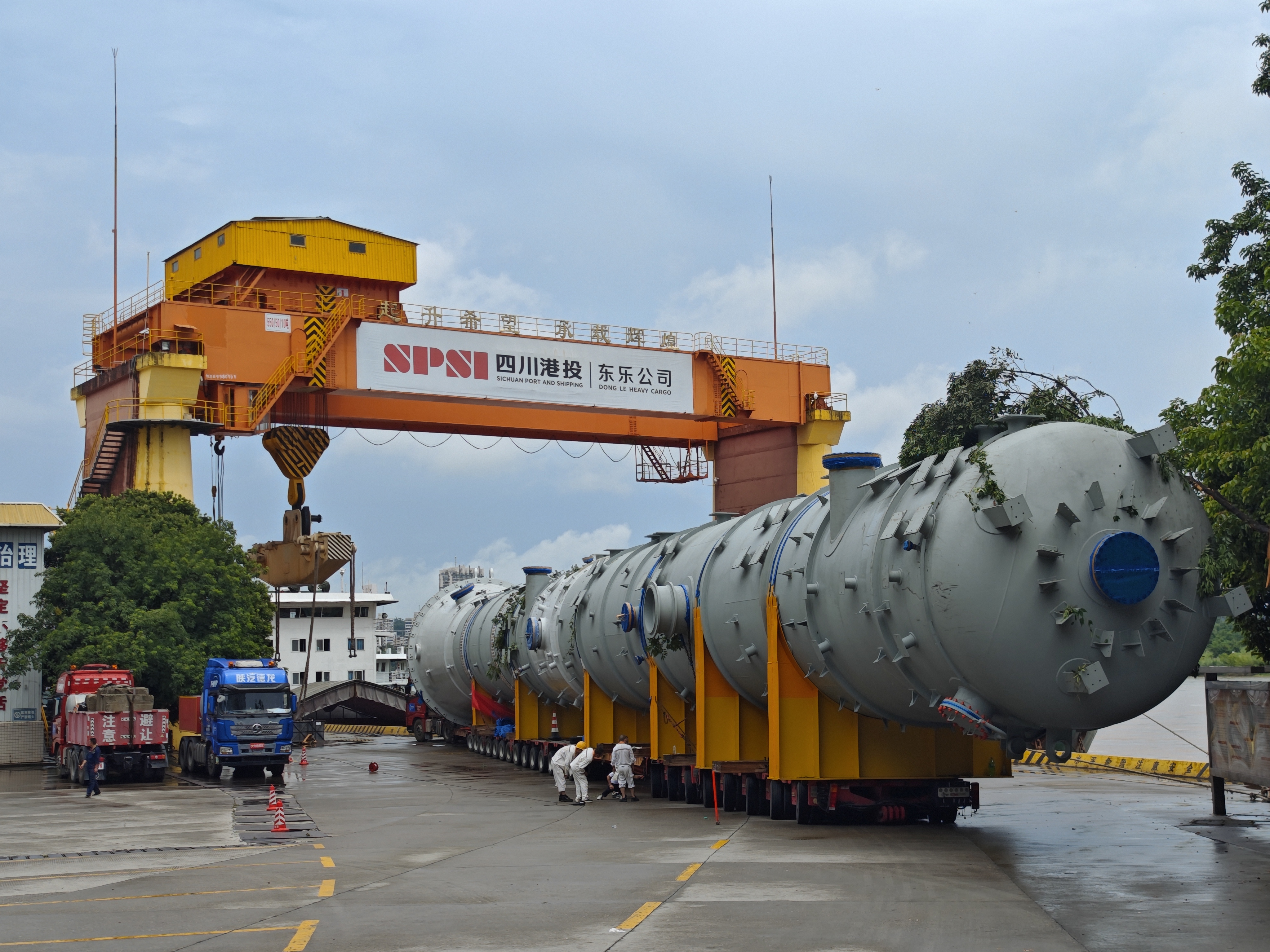 8月23日至24日,兩件由四川科新機(jī)電生產(chǎn)的“巨無(wú)霸”化工設(shè)備在樂(lè)山大件碼頭成功起吊并順利裝船。其中,高壓閃蒸塔重達(dá)280噸級(jí)、長(zhǎng)55米、直徑6.85米,刷新了2010年起吊彭州石化53米低壓反應(yīng)塔的歷史記錄,成為起吊長(zhǎng)度之最;另一件二氧化碳吸收塔重達(dá)300噸級(jí)、長(zhǎng)50米、直徑5.8米,同屬超長(zhǎng)、超寬、超高、超重設(shè)備,二者均將發(fā)往印度尼西亞巨港。