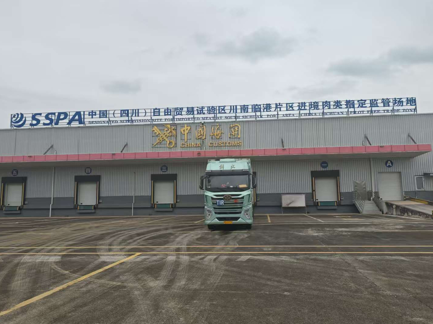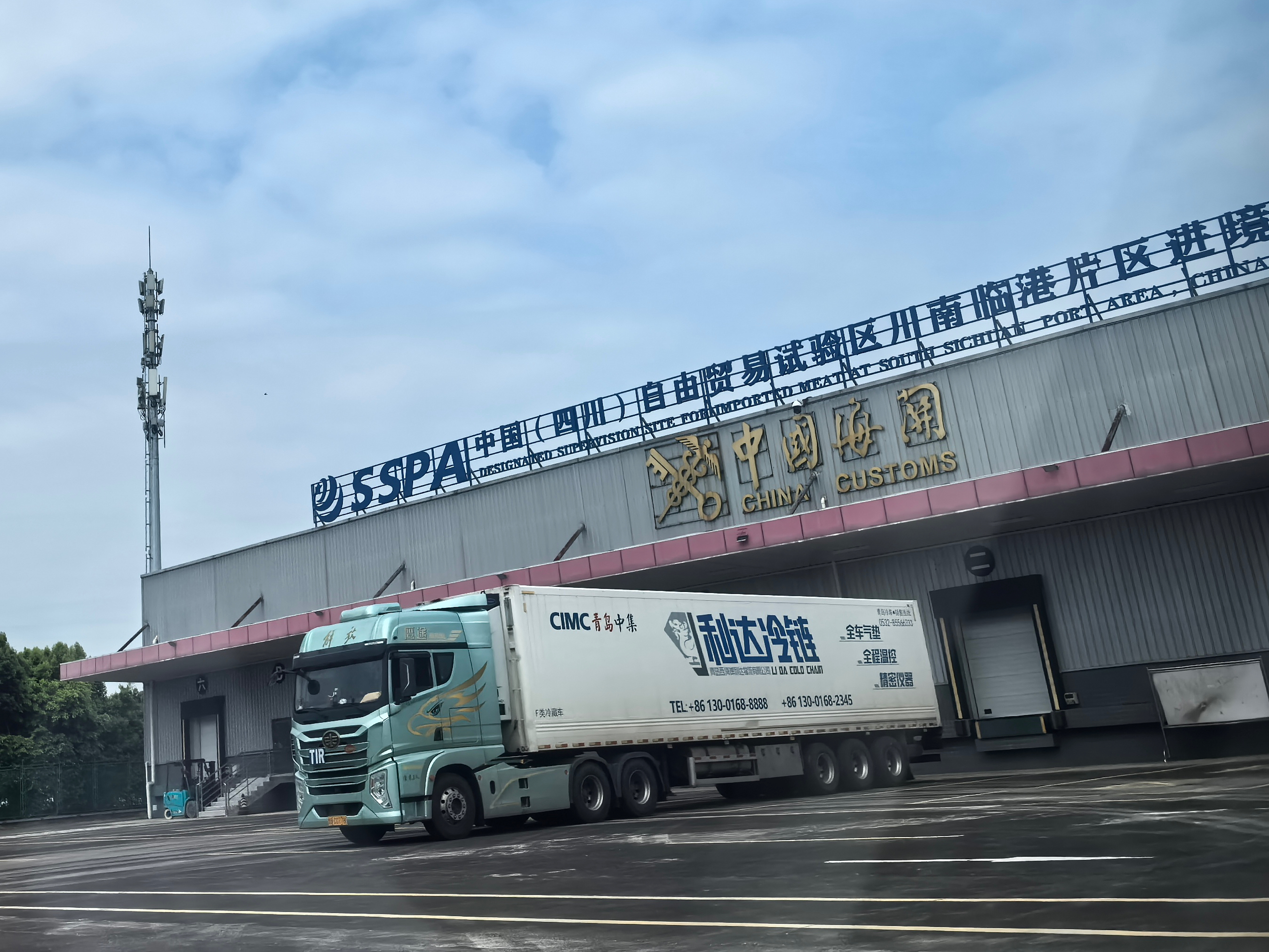本批貨物為冷凍雞爪,共計1374箱,貨值約5萬美元。該貨物持TIR單證冊,全程通過冷鏈集裝箱公路運輸,橫越多個國家與地區(qū),最終直達(dá)瀘州港海關(guān)監(jiān)管倉庫,實現(xiàn)了全程冷鏈無縫銜接。